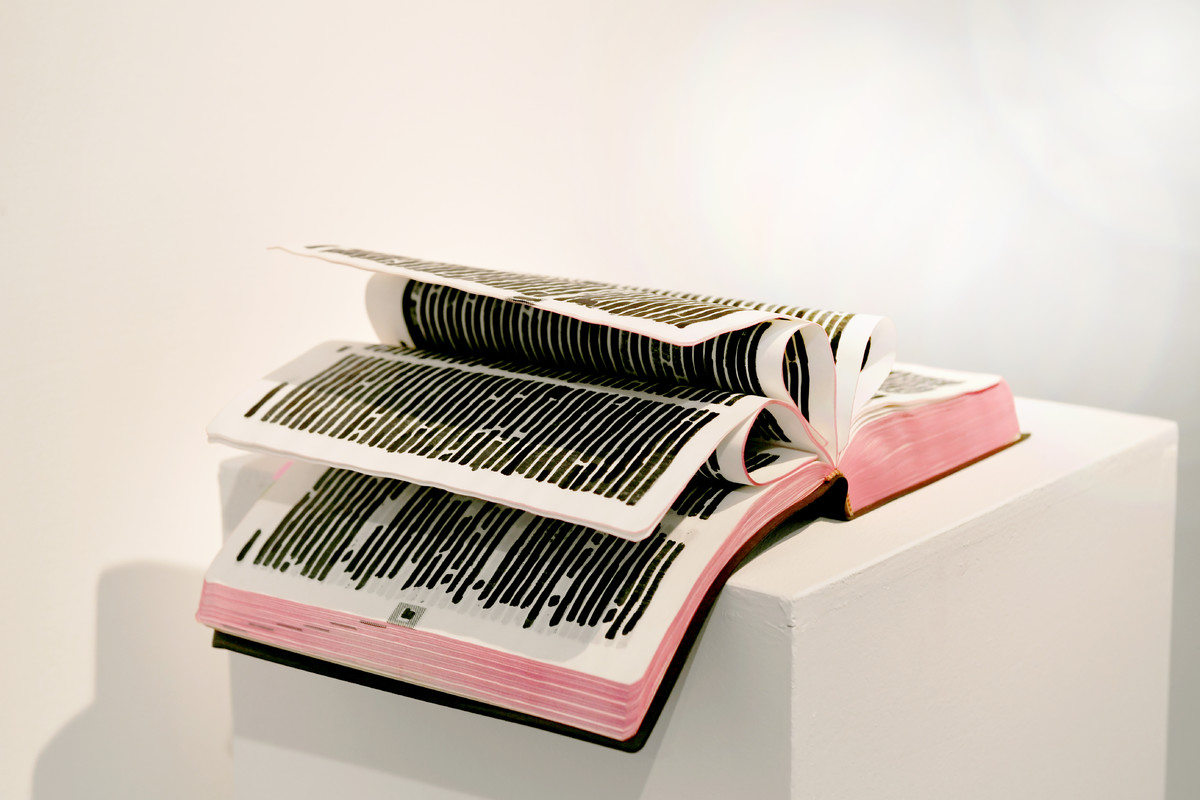 展览中的石玩玩的作品《一首小诗》是“将一本圣经中所有文字用黑色水笔全部涂抹掉,只剩下20个字。这些遗落在书中的字连成一篇小诗:‘无论我活着,还是我死去,我都是一只,快乐的牛虻。’” 这首“小诗”出自爱尔兰女作家艾捷尔•丽莲•伏尼契创作的长篇小说。该书讲述了意大利革命党人亚瑟•博尔顿(牛虻)通过积极的投入革命并为之献出了生命的一生的故事。其中的一个情节是主人公得知自己信仰的神父竟然是自己的亲生父亲,由此放弃了对基督教的信仰。作品实际上是从两个维度对《圣经》的意义进行了消解,首先是对《圣经》的涂抹,其二是通过另外一本书的介入导致了《圣经》意义的坍塌。