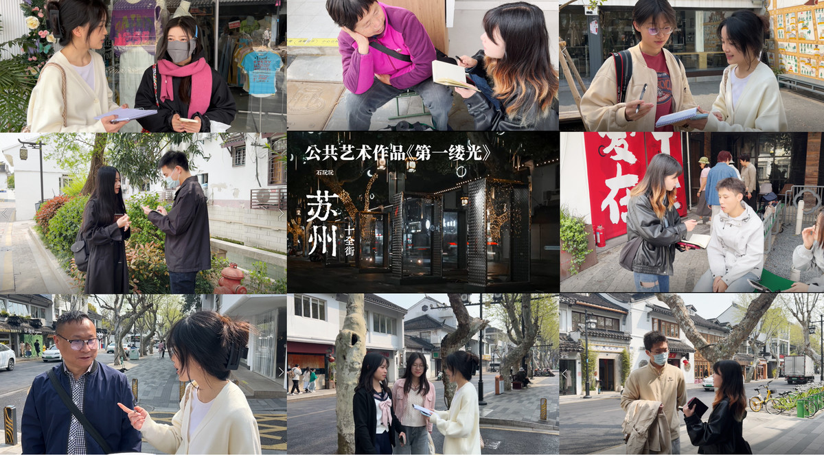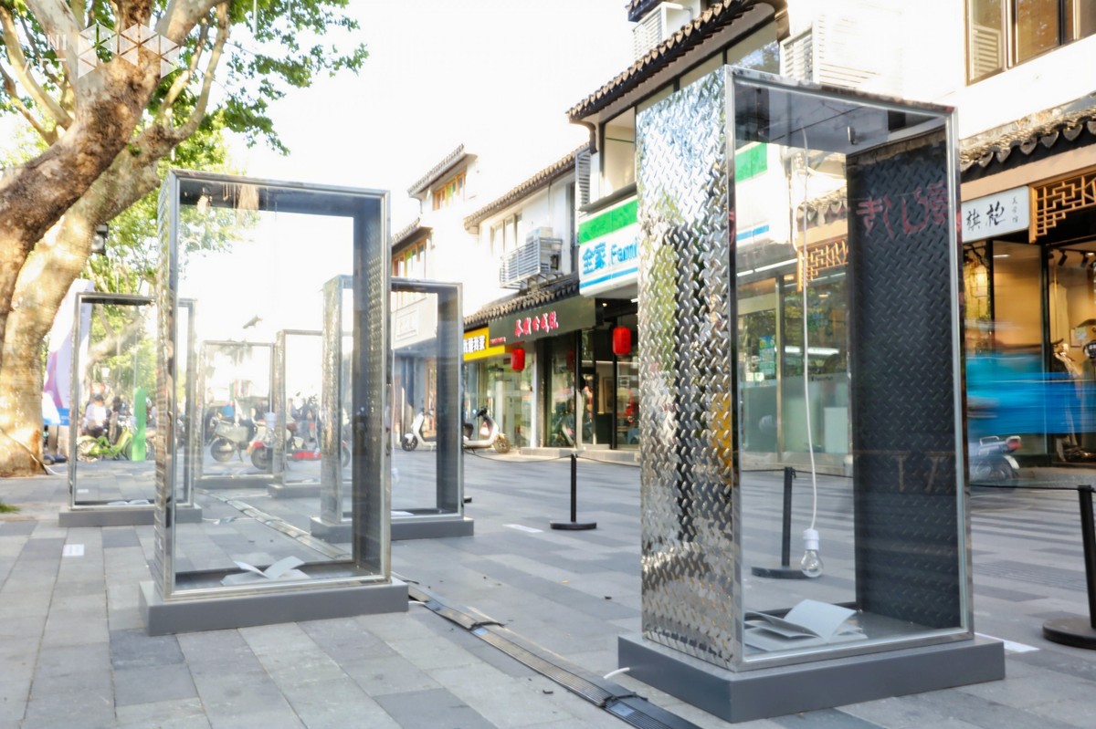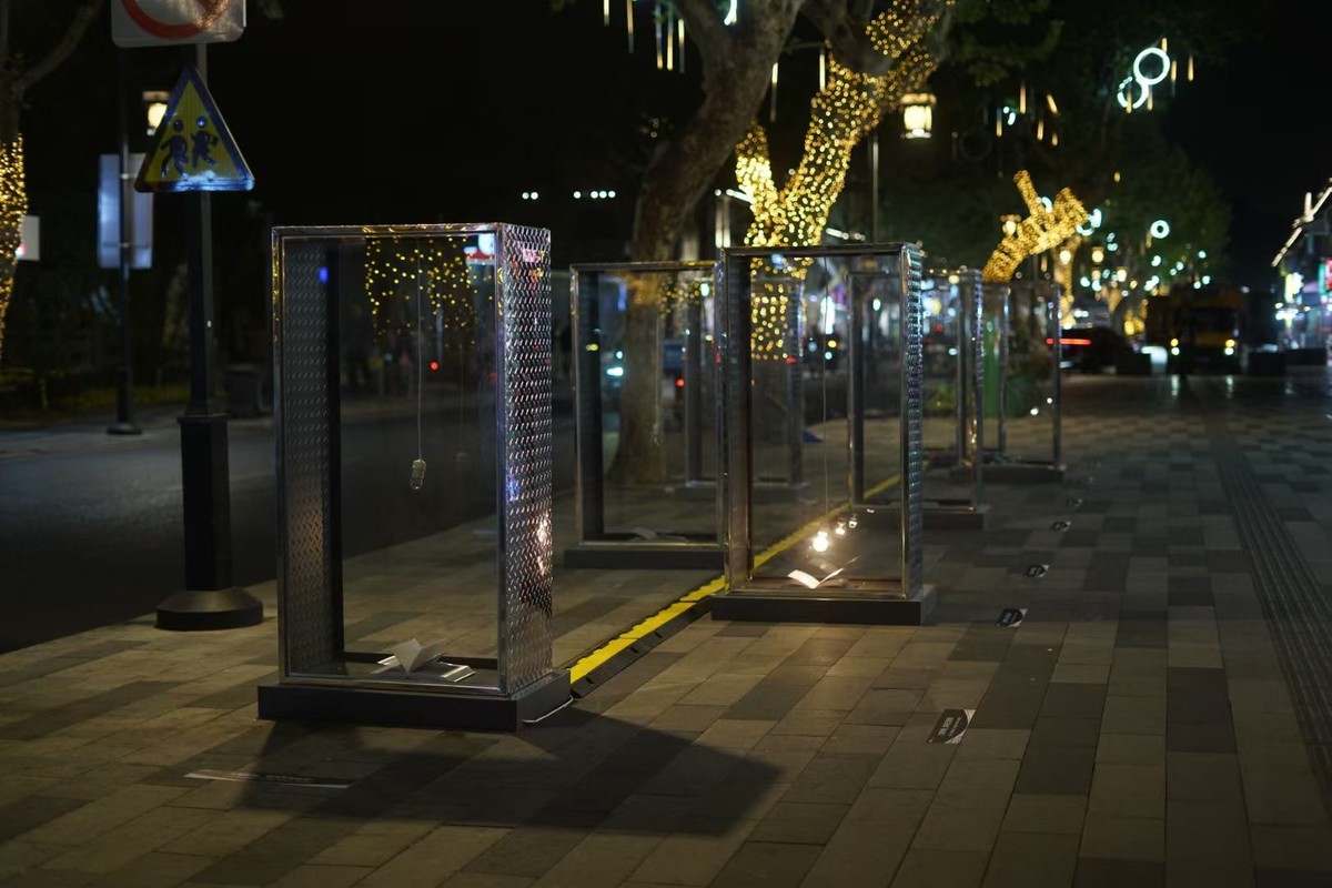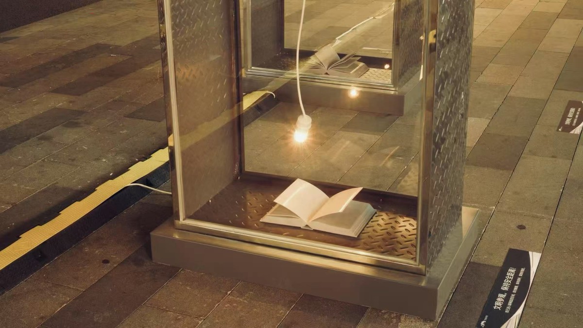 The installation (First Flicker of Light) is sited at the junction of the century-old Zhenhua Middle School (Zhenhua Girls' School) on Shiquan Street and Suzhou University in Suzhou, Zhejiang, China. Seven "wordless books" rest beneath individual incandescent bulbs, each pulsing in precise Morse code. These coded flickers convey reflections on "truth" gathered from local residents and passers-by.