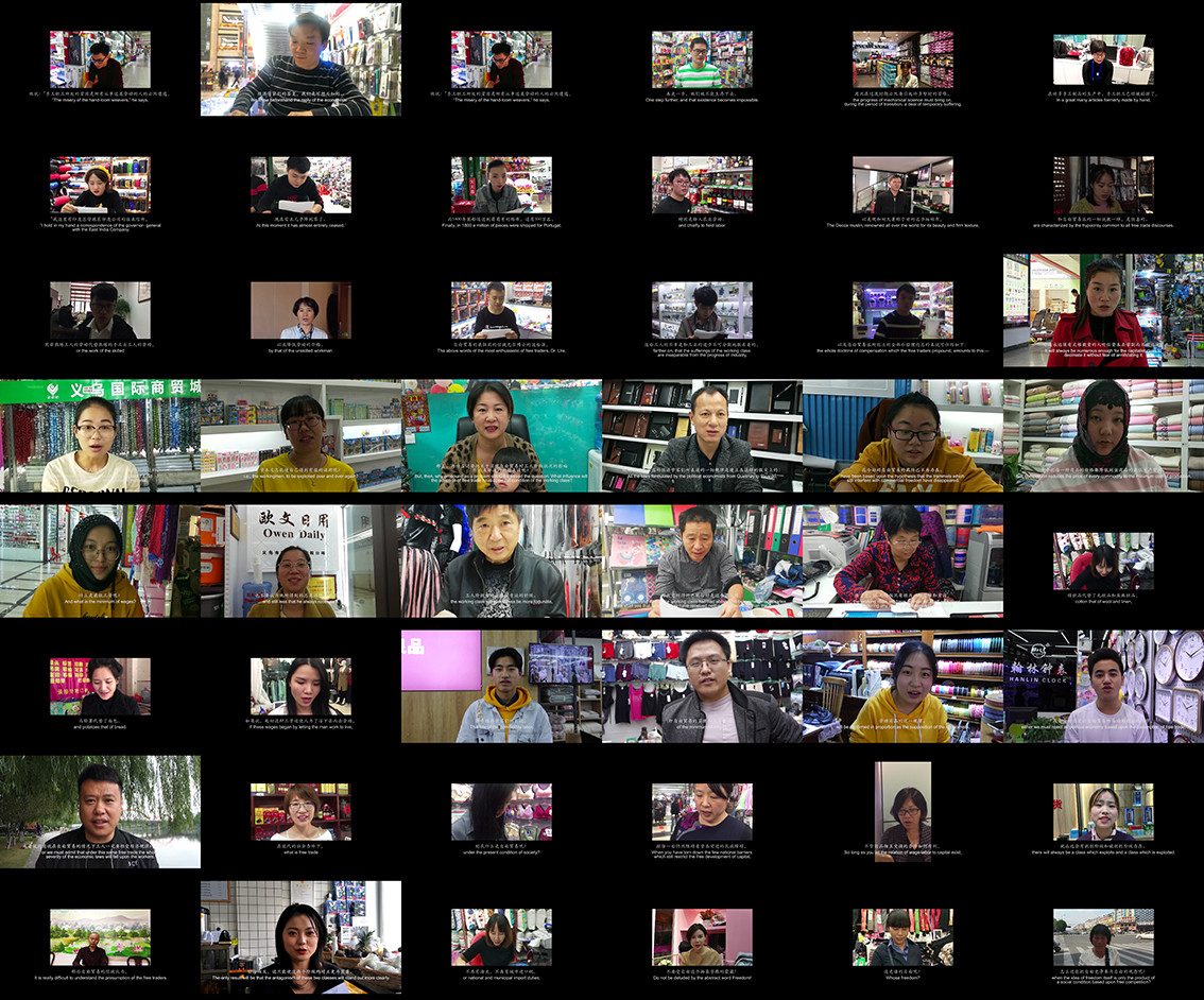2018年10月,艺术家邀请了116名义乌国际商贸市场里的生意人,一起朗诵了马克思在1848年发表的关于“自由贸易”的演讲稿(选段),并用录像记录下来。