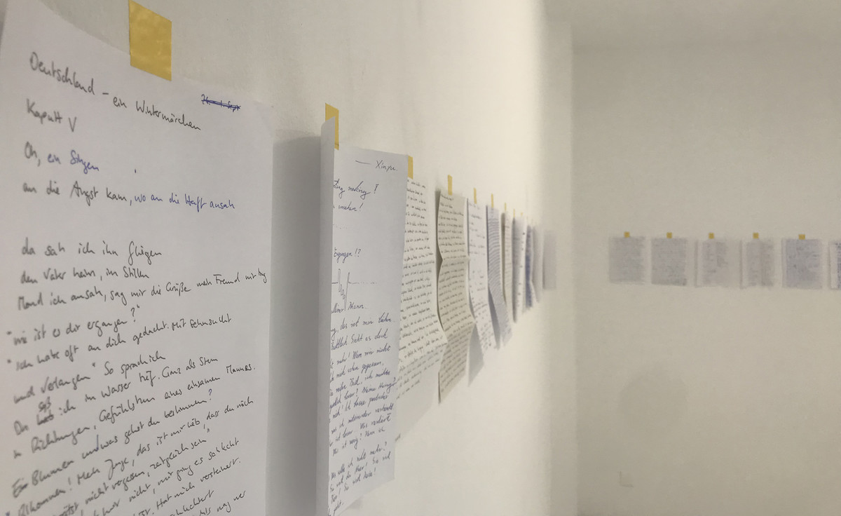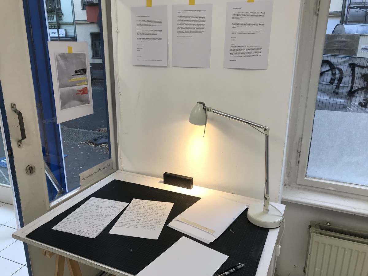 The project in Berlin is inspired by the words of Martin Heidegger: " Where words are broken, nothing exists " ( Kein Ding ist, wo das Wort gebricht ).The artist randomly downloaded a German poem(Germany, a winter's fairy tale by German poet Heine)from the Internet and with the help of Google Translate, tried to recite the poem in German and record it. The artist hopes that the German audience will re-write the content on paper as a "manuscript" after hearing the recording. The artist's recordings and the audience's "manuscripts" will present an incredible relationship.