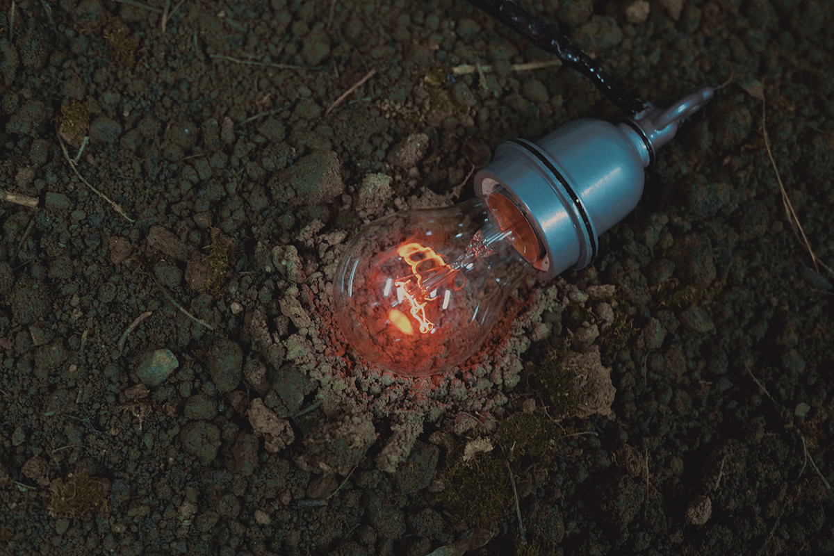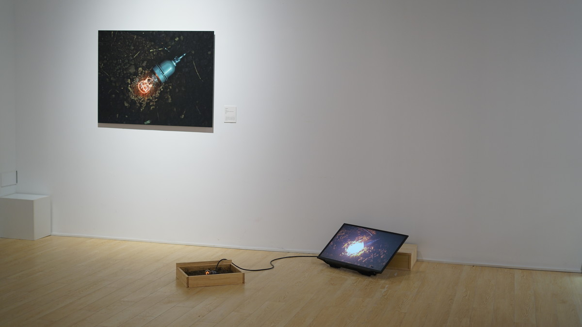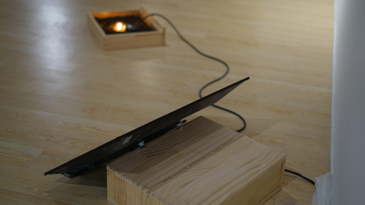 An incandescent bulb rests on the soil within a flat wooden drawer, flickering like a lonely, murmuring voice. As it flickers, moisture from the soil slowly evaporates into the exhibition space, creating a subtle separation between water and earth in a whispered monologue. The bulb's flickering encodes a message in Morse code, referencing a line from Silent Spring: "When spring falls silent, we realize that what we have lost is not just birdsong and fragrance, but also the inner peace and harmony within ourselves.”