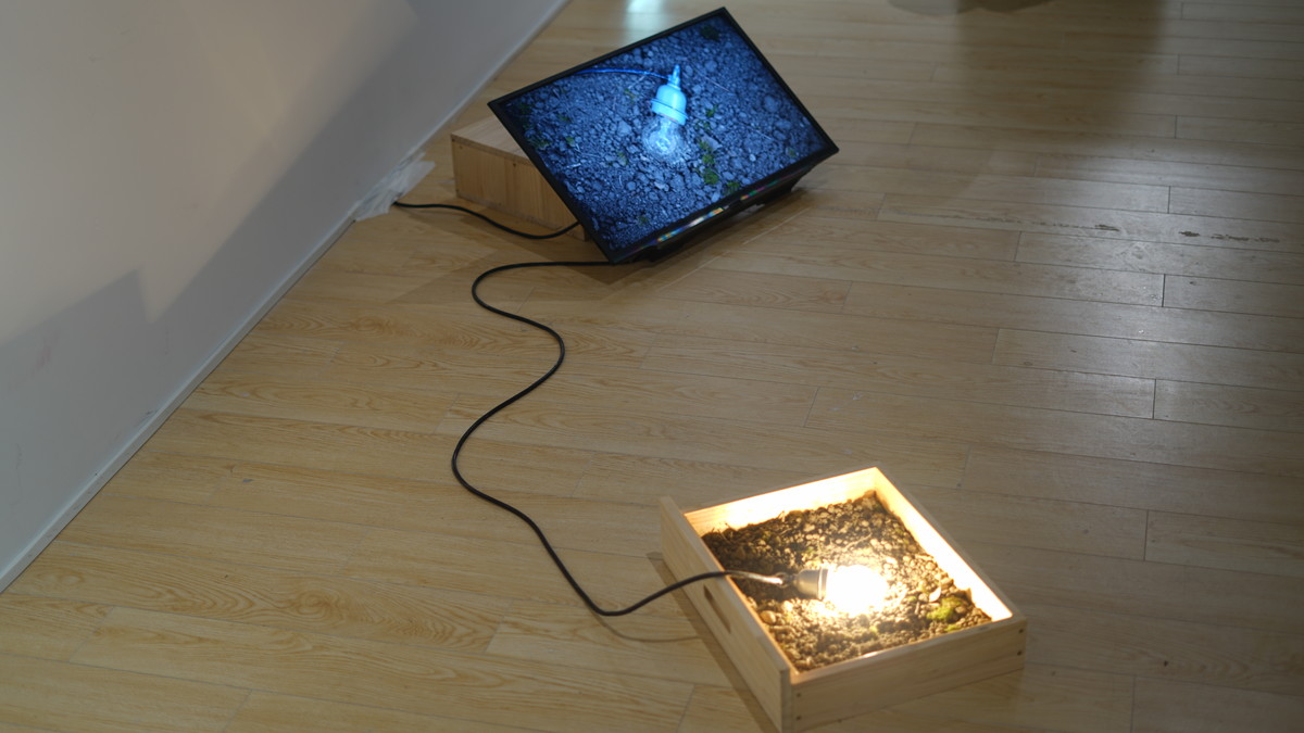 抽屉里的土壤上放置一个白炽灯泡,灯泡一直在闪烁,土壤里的水分缓慢的在展厅里蒸发,水土在灯泡的喃喃细语中慢慢分离。