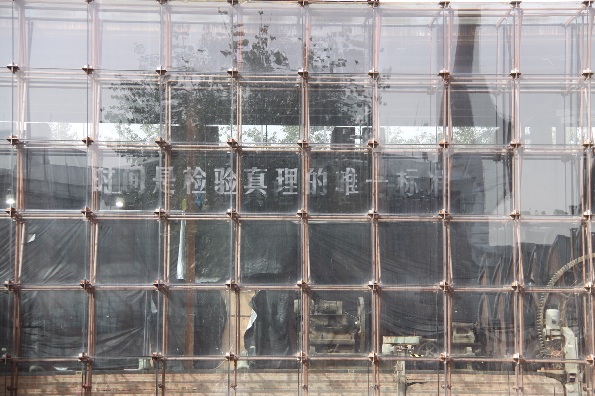 The sentence - “Time is the sole criterion for testing truth” - was written on the glass with glue. Over time, the sentence has gradually turned clearer as more and more dusts attached to the glue.