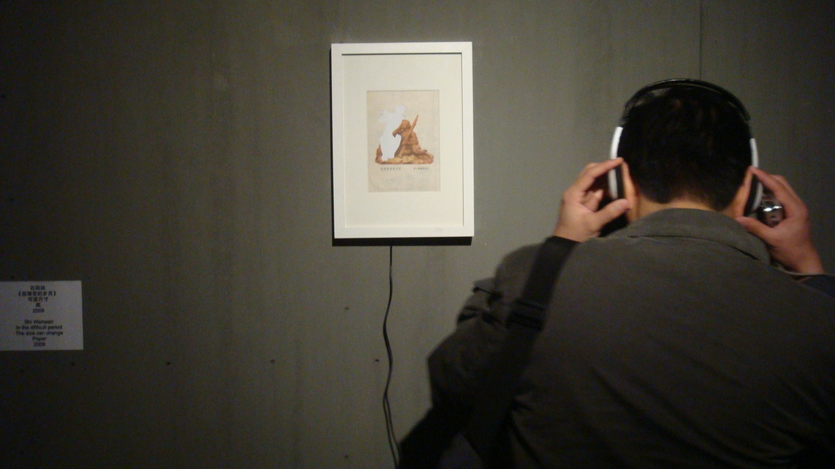 装置 ,纸为18x12.5cm、木框上油漆、录音播放器、耳机 声音为循环播放 ,2009