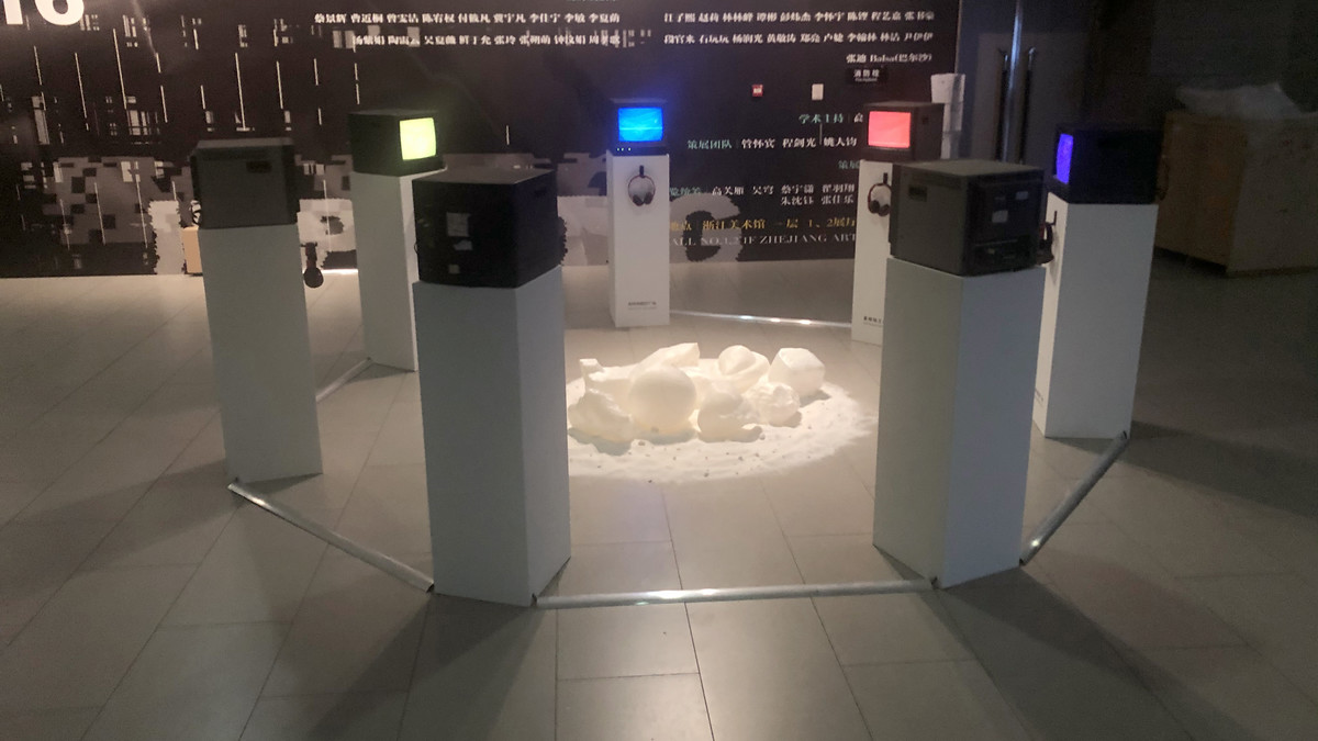 将世界上爆发过革命的七个广场上的小石子收集过来,放大成石头并在展厅里围合成一个“独立广场”。七个监视器里飘扬着七种颜色的旗帜,耳机里播放这七个国家的语言对广场的描述。作品中这些石头的图像数据通过互联网和社交媒体,在网友的协助下得以收集。它们虽然来自真实的广场,但最终呈现在展厅里的是数字模型物,它们与电脑绘制的旗帜、人工AI的声音共同构建的是一个“算法世界”里的“广场”。
